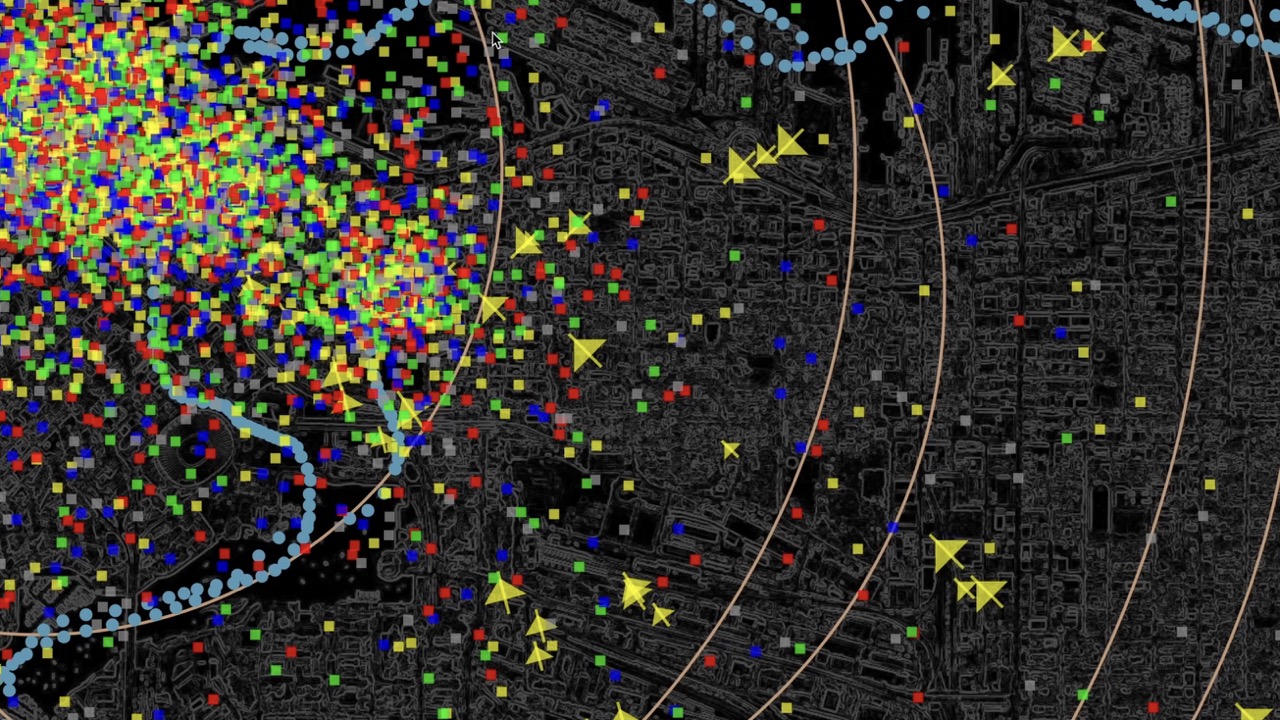 Each work in the series begins with a generative animation, completed using Processing, an open source software toolkit for the arts. The animations took as their starting condition the geography of each location, centered on the gallery or arts space at which the work was exhibited. I conducted additional research into locations of power plants in the cities, local bodies of water, and the locations of nearby data centers.