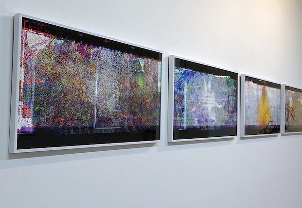 In its initial incarnation, the work took shape as a series of 15 prints, which each contained three layers. The bottom layer was a manually screenprinted transparency grid, similar to what you would find in an application like Photoshop. The top layer was the original photo printed on archival rag, but the print has been laser cut to remove the things that the generator ignored or misinterpreted.