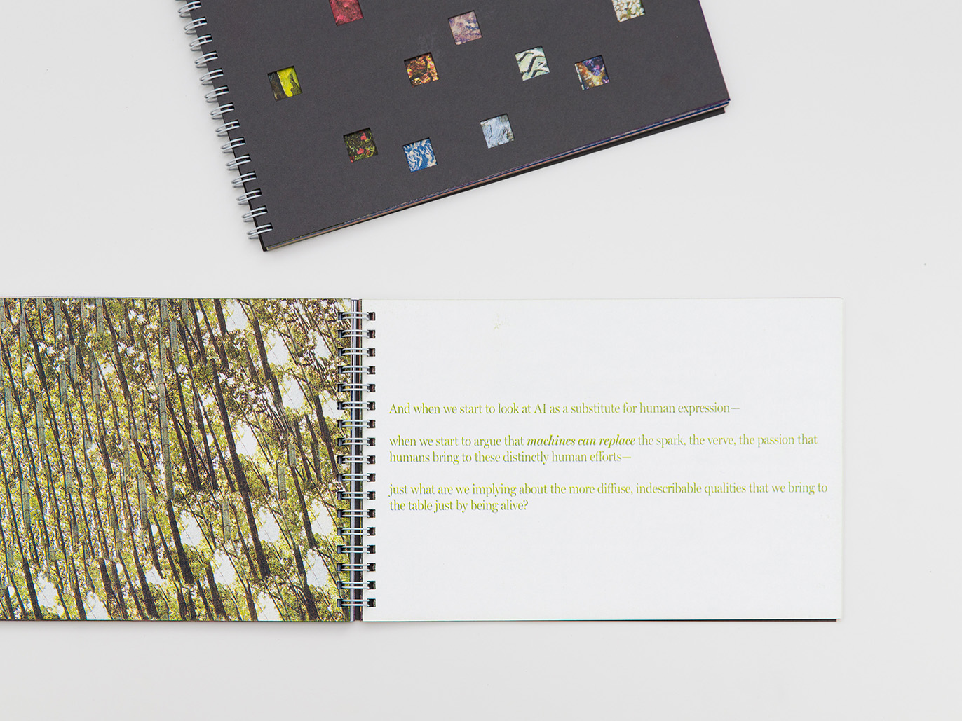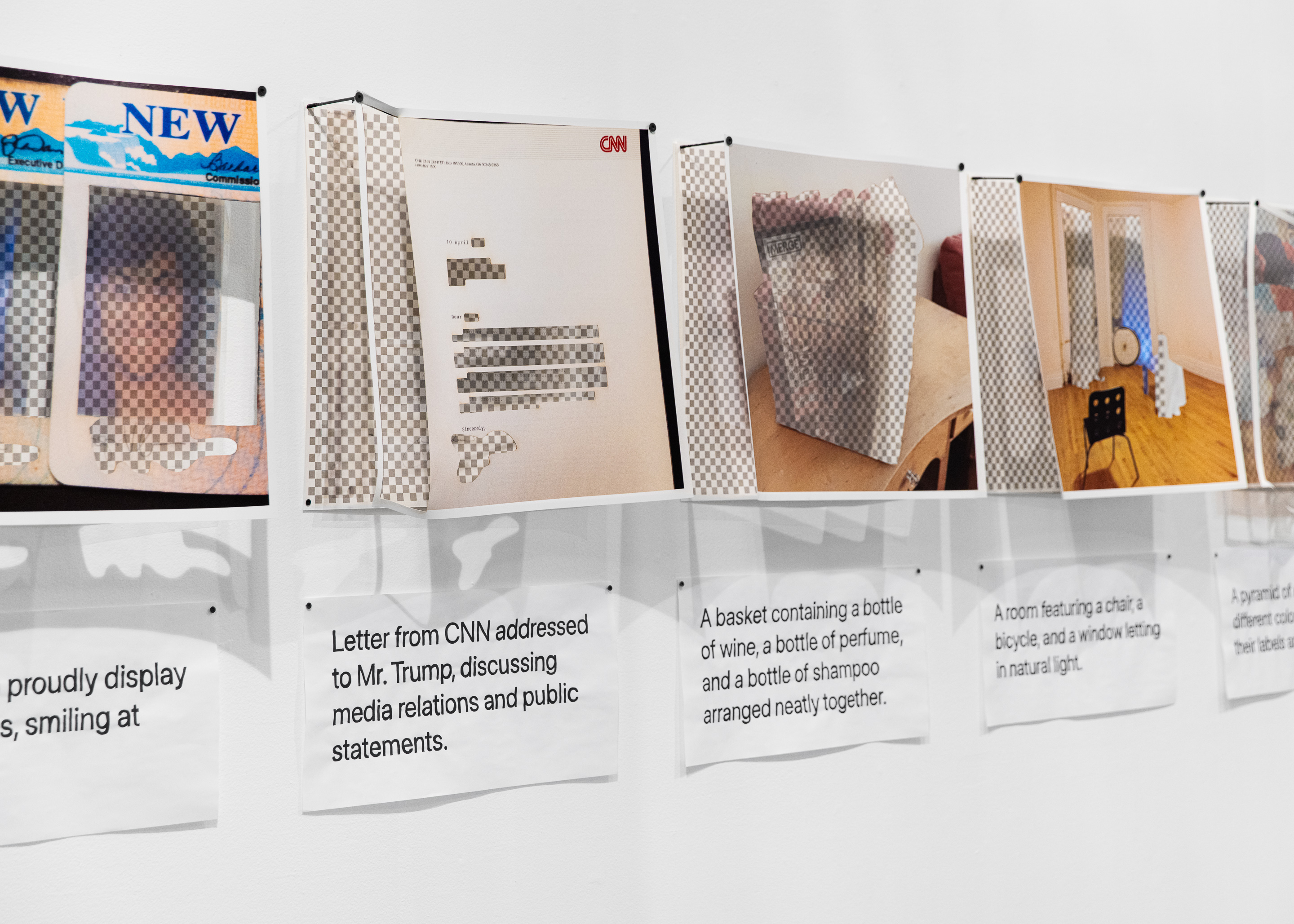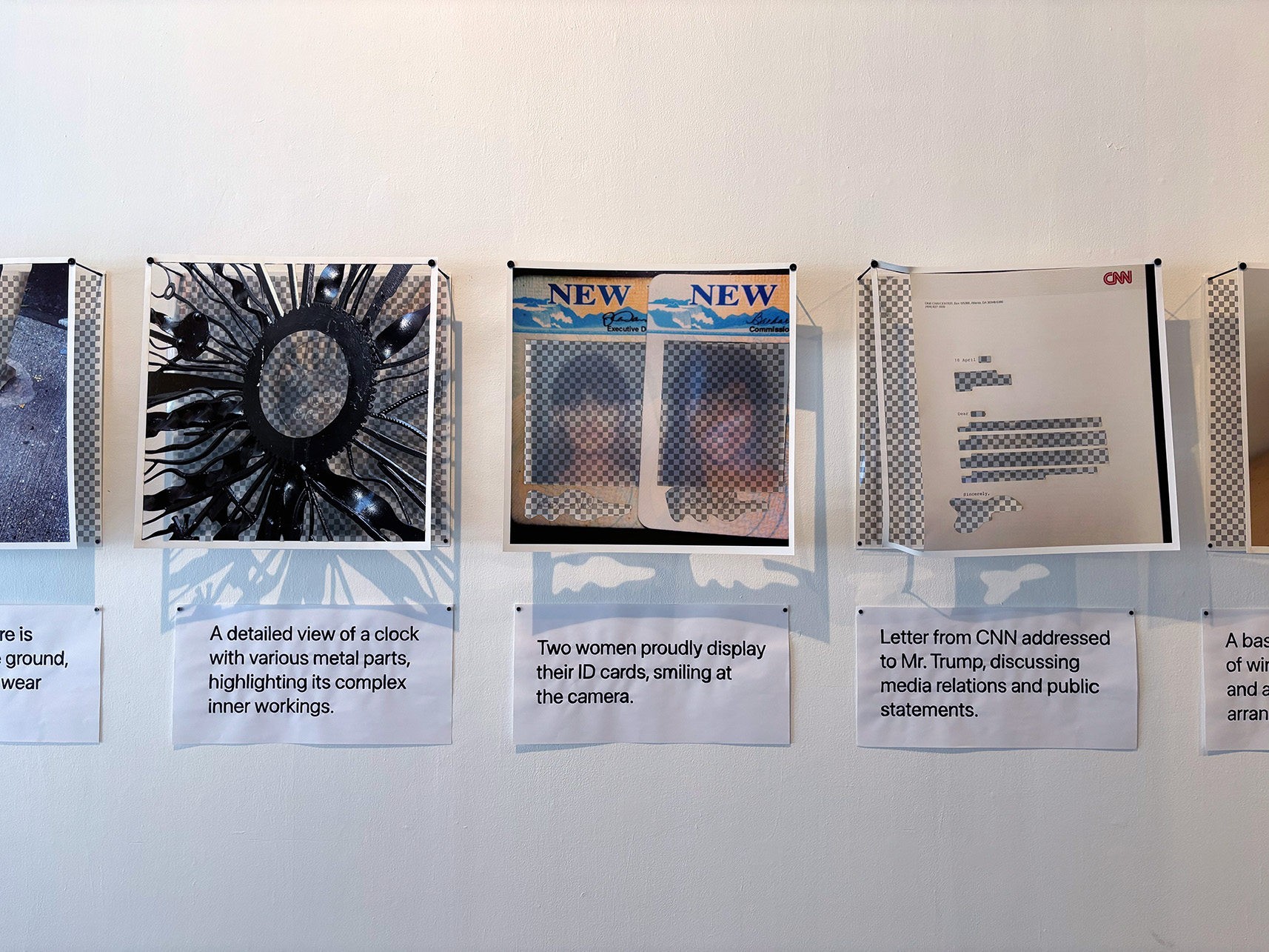 Those removed elements were then printed at a reduced opacity on transparent film and installed as the middle layer, visible through the holes in the top and offering a ghostly reminder of what the AI was incapable of seeing. A hand-inked version of the caption was displayed on bond paper underneath.
