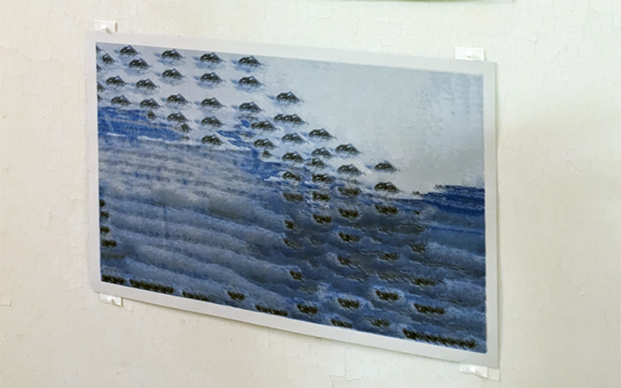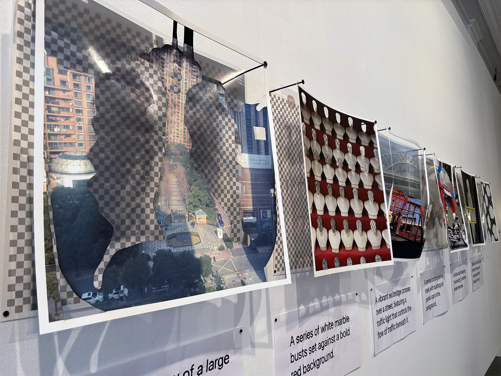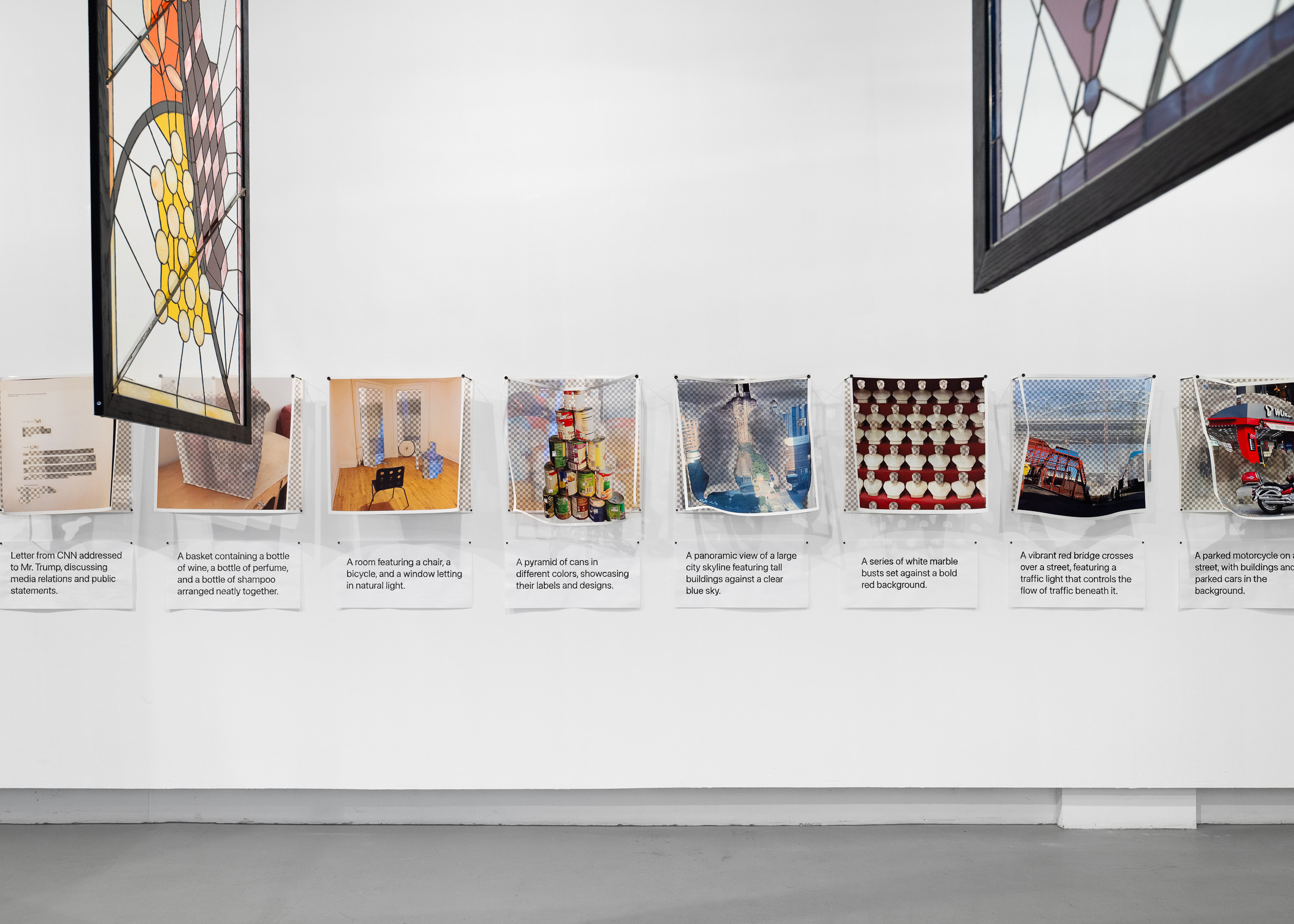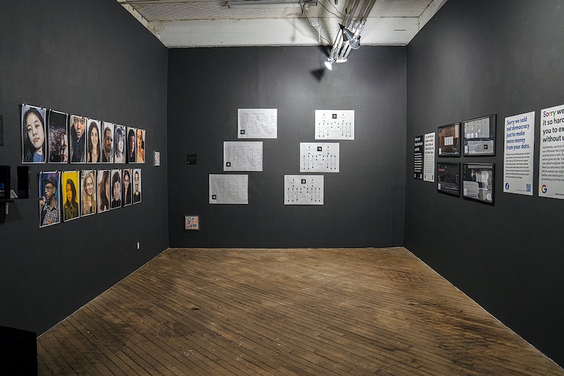 Those removed elements were then printed at a reduced opacity on transparent film and installed as the middle layer, visible through the holes in the top and offering a ghostly reminder of what the AI was incapable of seeing. A hand-inked version of the caption was displayed on bond paper underneath.