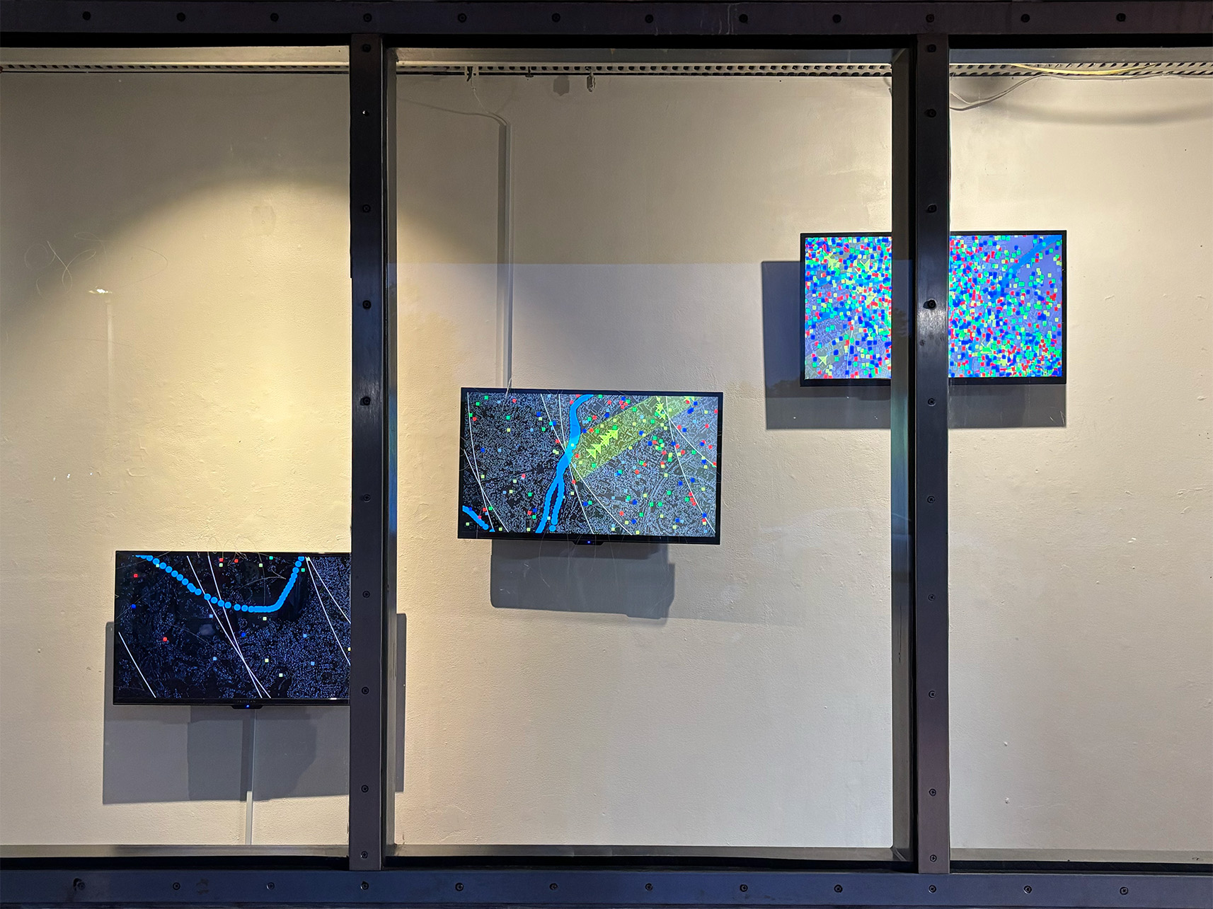 Pressure Systems was created for the Data Fluencies Exhibition Series, which I organized as part of the Data Fluencies Project (2022â2025) and which took place at three galleries across North America in 2025. For the Boston exhibition, the work was exhibited as a three-channel video installation of the animation. The videos were synced across the monitors, offering a lateral view of the flows to and from data centers in the city. In Vancouver and Lexington, the work was realized as transparent vinyl clings over the windows of the spaces, on which stills taken from the animation (sans maps) were printed.