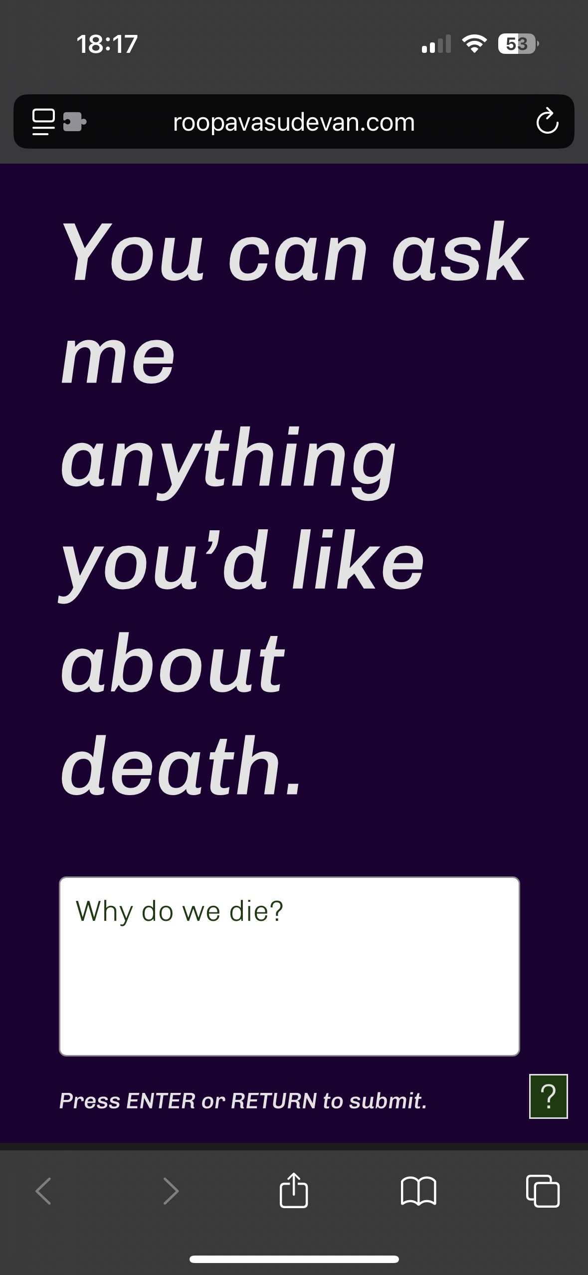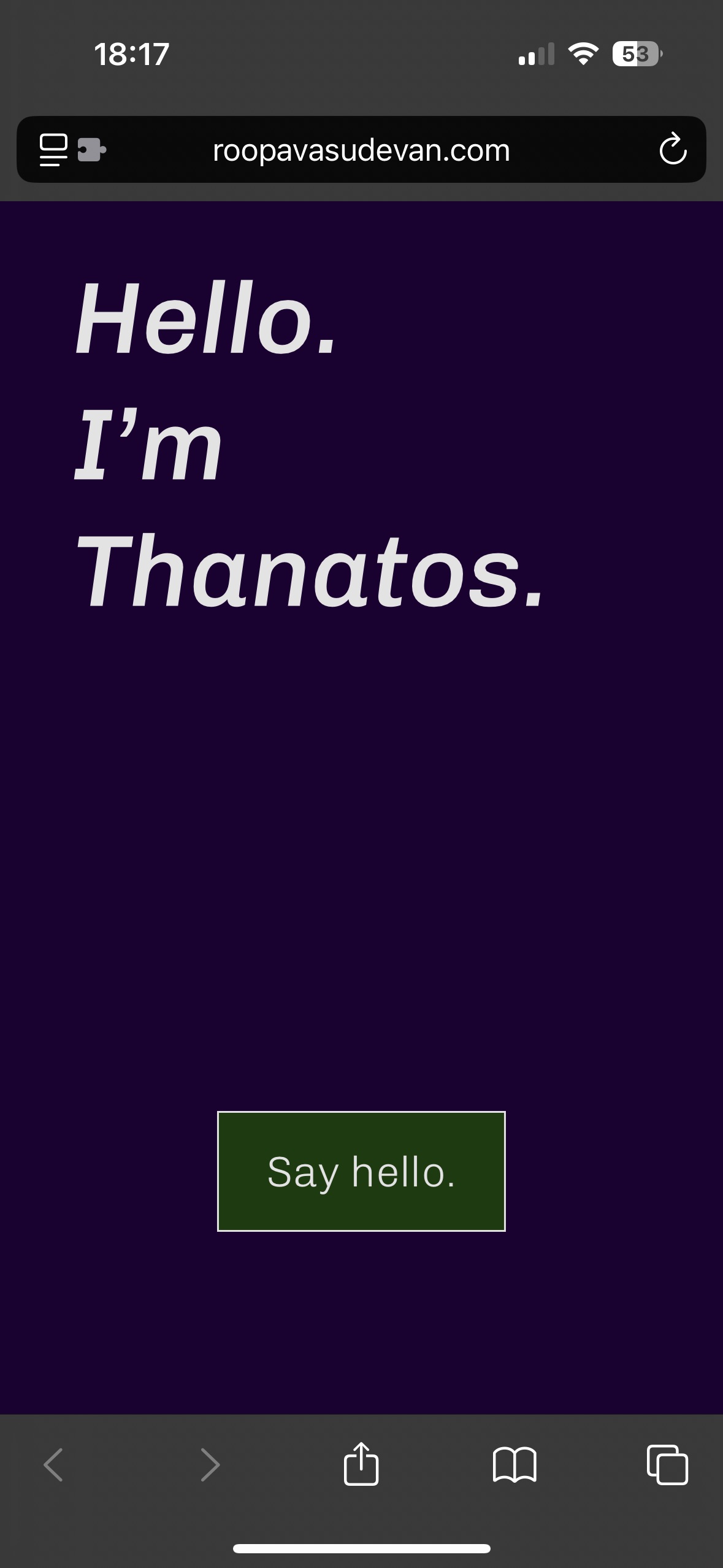 Chat with Thanatos here. This project is an artistic exploration and not meant to serve as a substitute for therapy or end of life support. If you or someone you know is struggling, call the 988 crisis hotline.