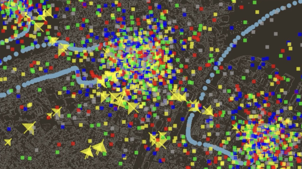 Each work in the series begins with a generative animation, completed using Processing, an open source software toolkit for the arts. The animations took as their starting condition the geography of each location, centered on the gallery or arts space at which the work was exhibited. I conducted additional research into locations of power plants in the cities, local bodies of water, and the locations of nearby data centers.