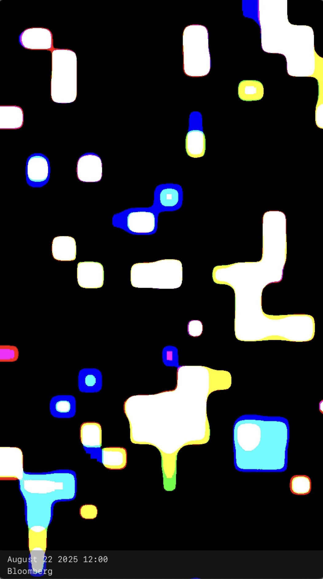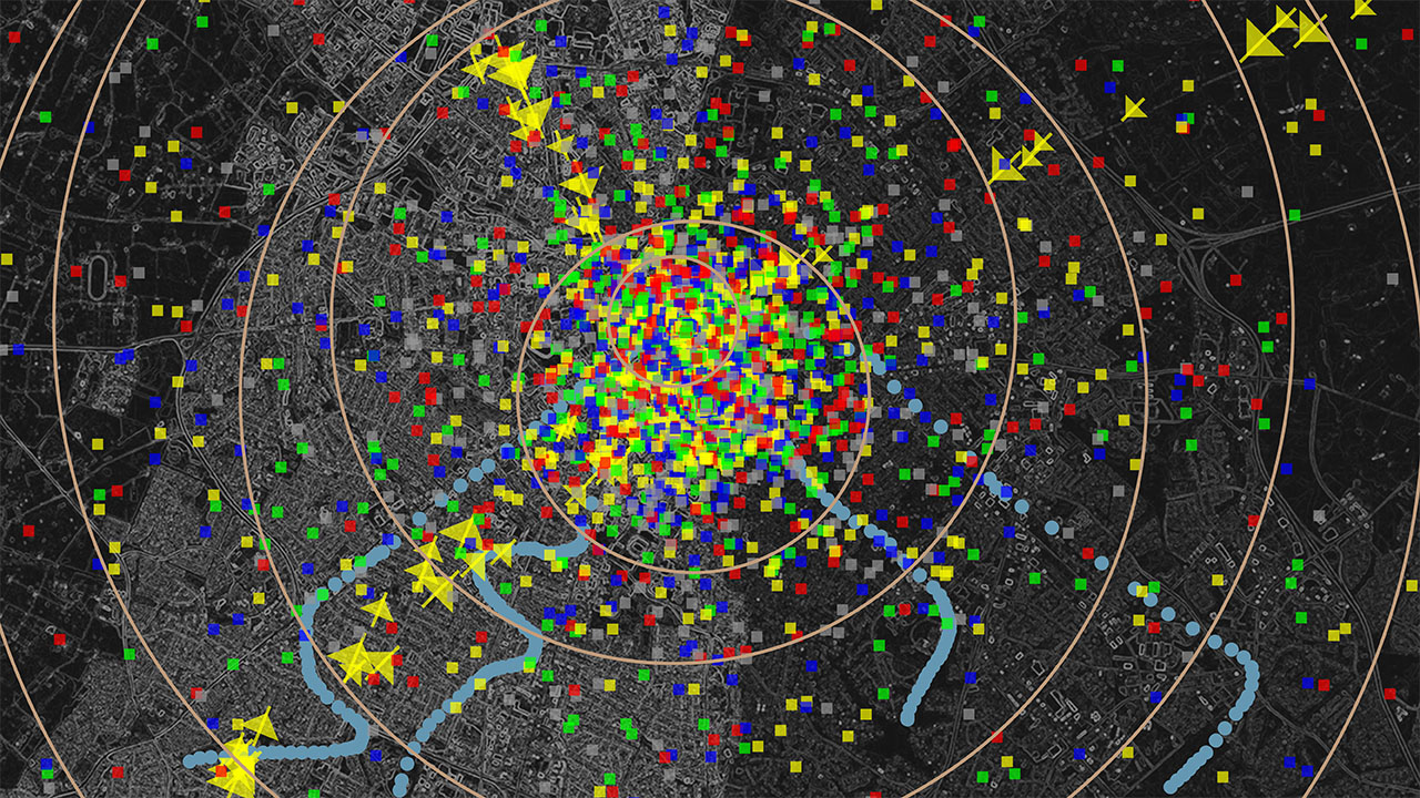These locations and relationships serve as the basis for renderings of imagined âflowsâ of materials to and from the sites of the data centers. The movement of electrical current and water is represented by icons or symbols that are used to represent or denote it, or its equivalent, on weather maps and schematic diagrams. As the animations progress, what begin as manageable streams of water and power to the sites of the data centers quickly escalate out of control as âstormsâ of data start to emerge, fed by (and demanding more of) the resources pouring into the centers. Over time, rings symbolizing âpressure systemsâ â areas of local deviation or fluctuation from the surrounding conditions â begin to appear, trained on the data centers and indicating increasing instability in the digital atmosphere.