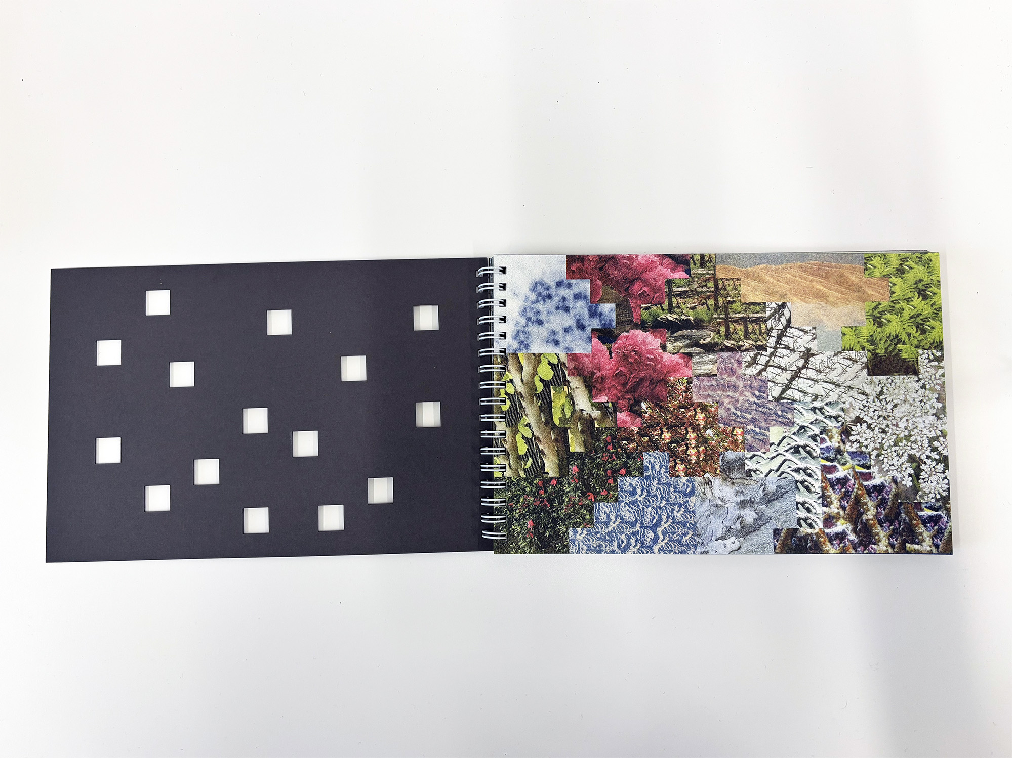 Digital prints on laser cut HahnemĂŒhle photo rag; digital prints on transparent polymer film; screenprint on acid-free card stock; hand-inked caption on bond paper