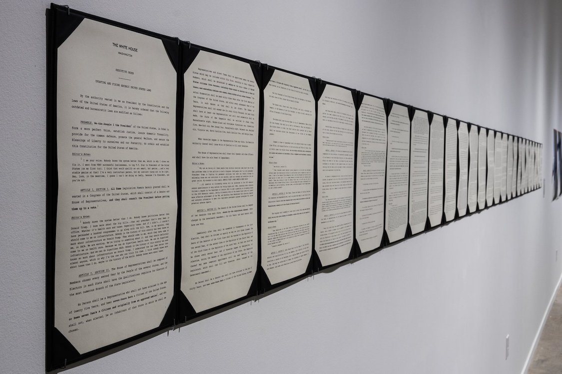 The first two iterations of this project, Editorâs Notes (Amendments) and Editorâs Notes (Constitution), examine the entirety the United States Constitution. They are formatted to resemble a Presidential Executive Order, which Trump used frequently in order to enact the more controversial portions of his platform without legislation. Amendments was completed in 2017, and Constitution in 2018.