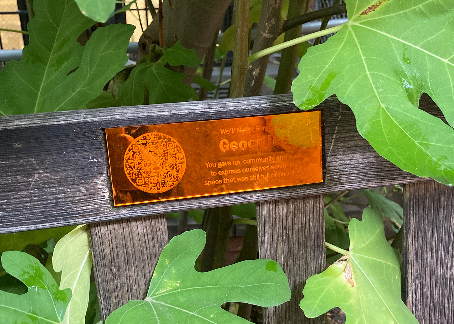 Requiem for the Early Internet is a series of commemorative plaques for public benches that memorialize the pre-Big Tech Internet. The plaques pay tribute to digital spaces and tools prevalent in the 1990s and early 2000s, which have largely vanished with the advent of platform capitalism and the tightening control over online space exerted by a small number of giant monopolies.