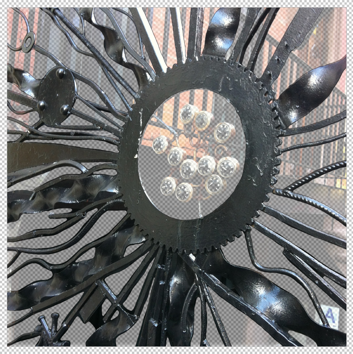 In its initial incarnation, the work took shape as a series of 15 prints, which each contained three layers. The bottom layer was a manually screenprinted transparency grid, similar to what you would find in an application like Photoshop. The top layer was the original photo printed on archival rag, but the print has been laser cut to remove the things that the generator ignored or misinterpreted.