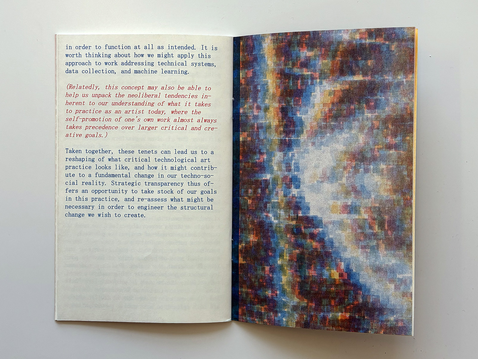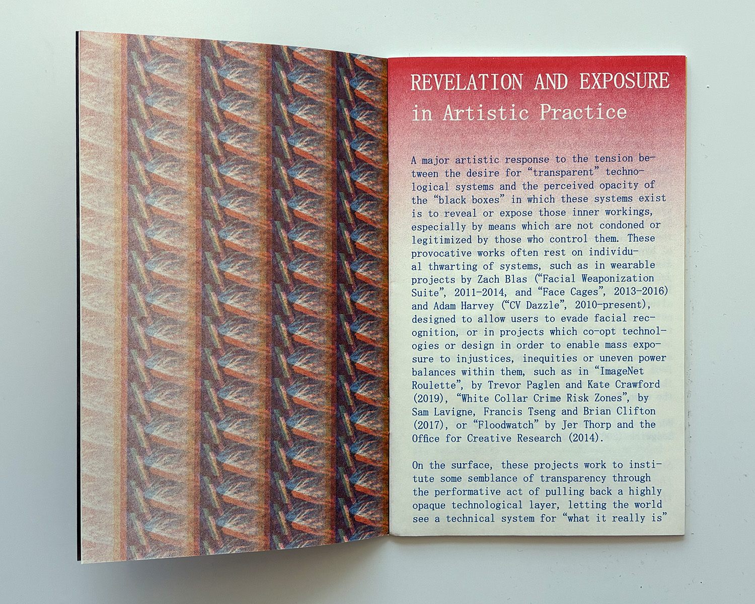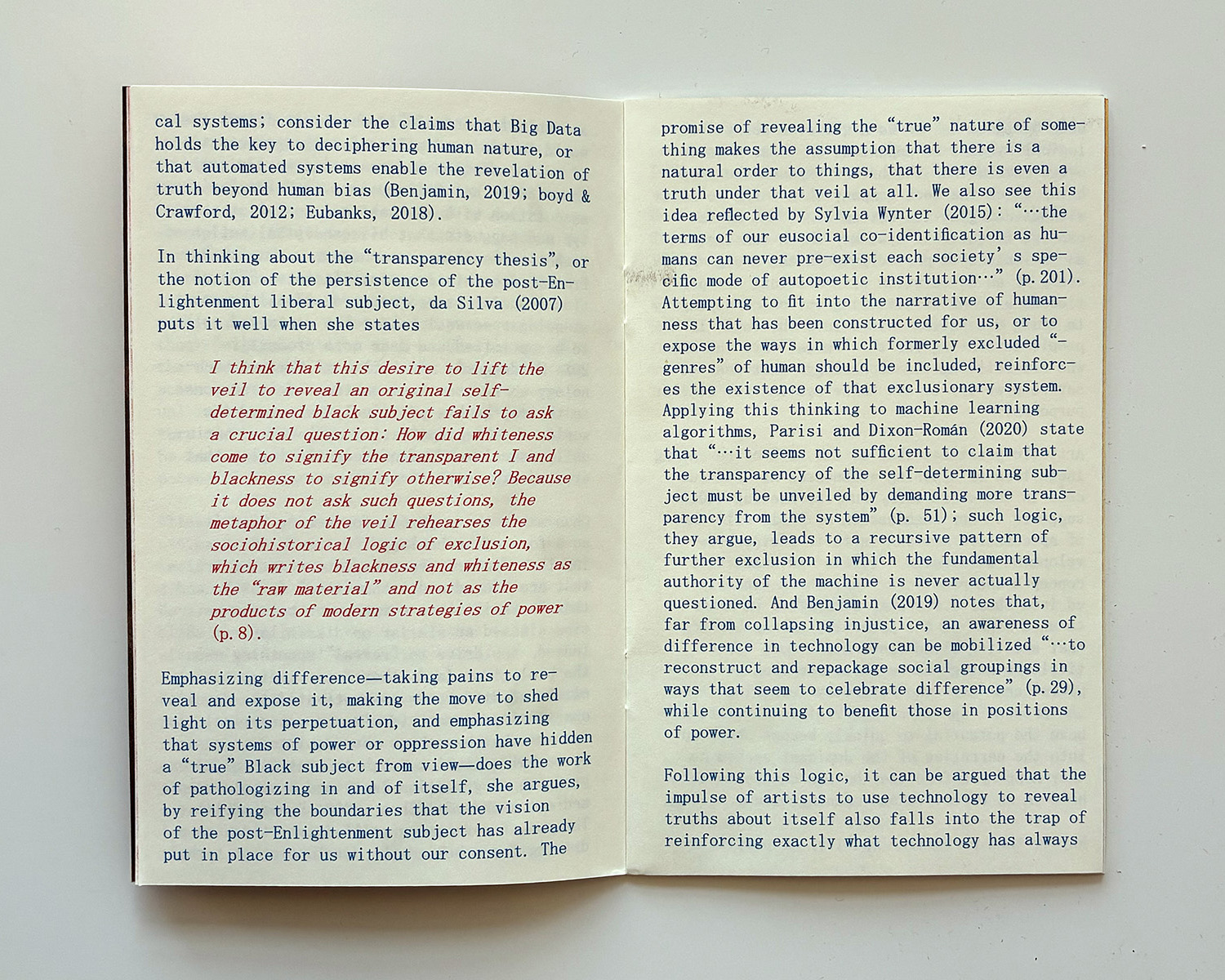 Read reflections on the work, along with an interview with curator Tessa Bachi Haas and fellow exhibiting artist Nicolo Gentile, in the catalog for HARD MEDIUM SOFTWARE, which accompanied the exhibition of the same name at AUTOMAT Collective in Philadelphia (May 2022). The project was also featured in the exhibition Selective Attention: Interventions into the Computational Gaze, on view at the Annenberg School at Penn from August 2022 through May 2023.